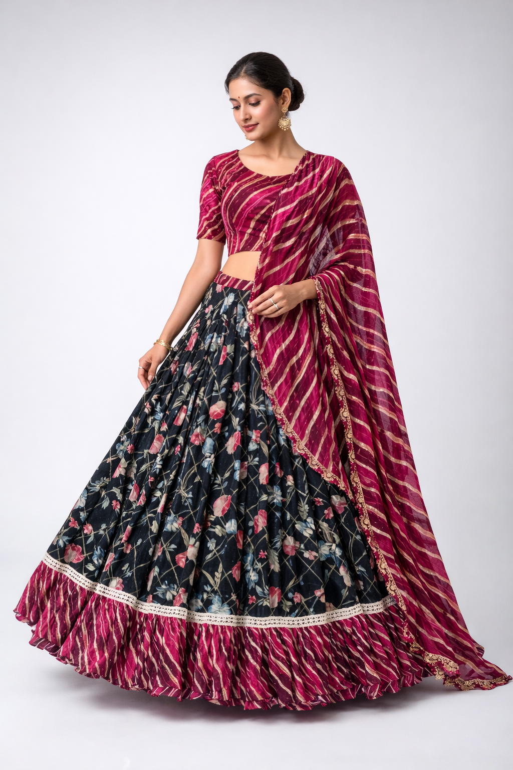 This elegant Gopi dress set is a beautiful combination of traditional charm and modern style. The magenta leheriya printed blouse pairs perfectly with the black floral flared skirt, creating a graceful and eye-catching look. The skirt is enhanced with a stylish leheriya ruffle border and delicate white lace detailing, adding extra elegance and volume.